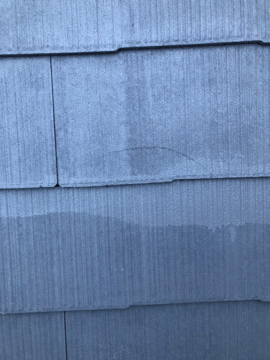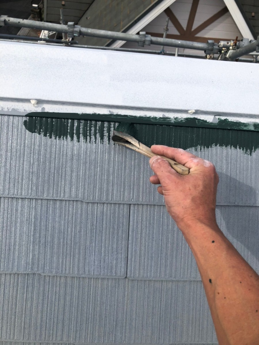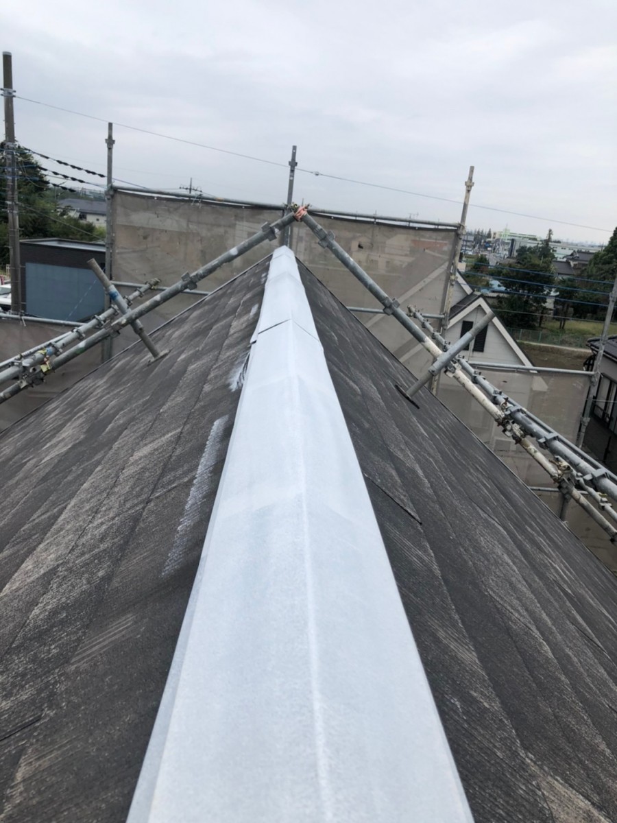 屋根塗装工事 コロニアル割れ補修、棟板金釘をビスに交換コーキングします。