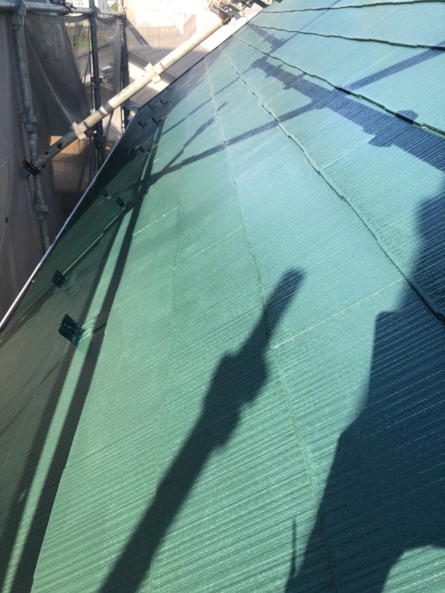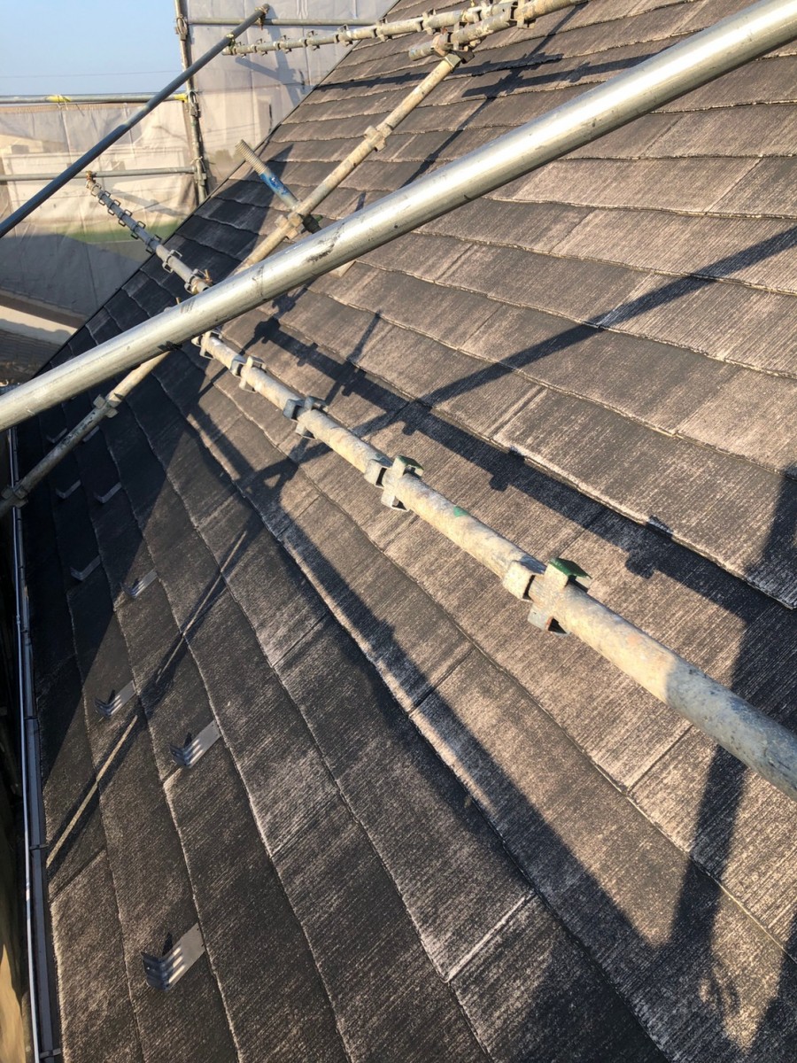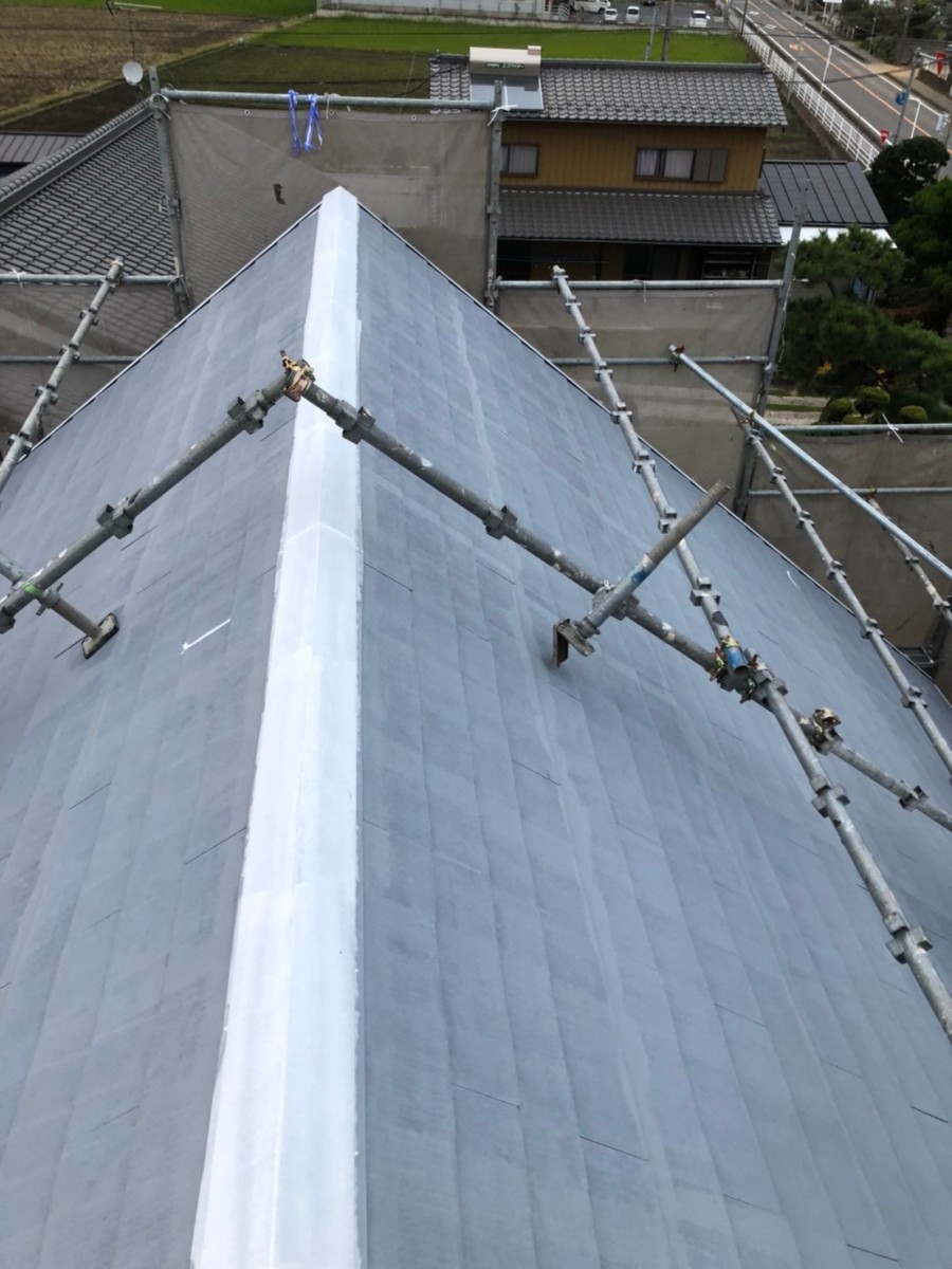 屋根塗装工事 コロニアル割れ補修、棟板金釘をビスに交換コーキングします。