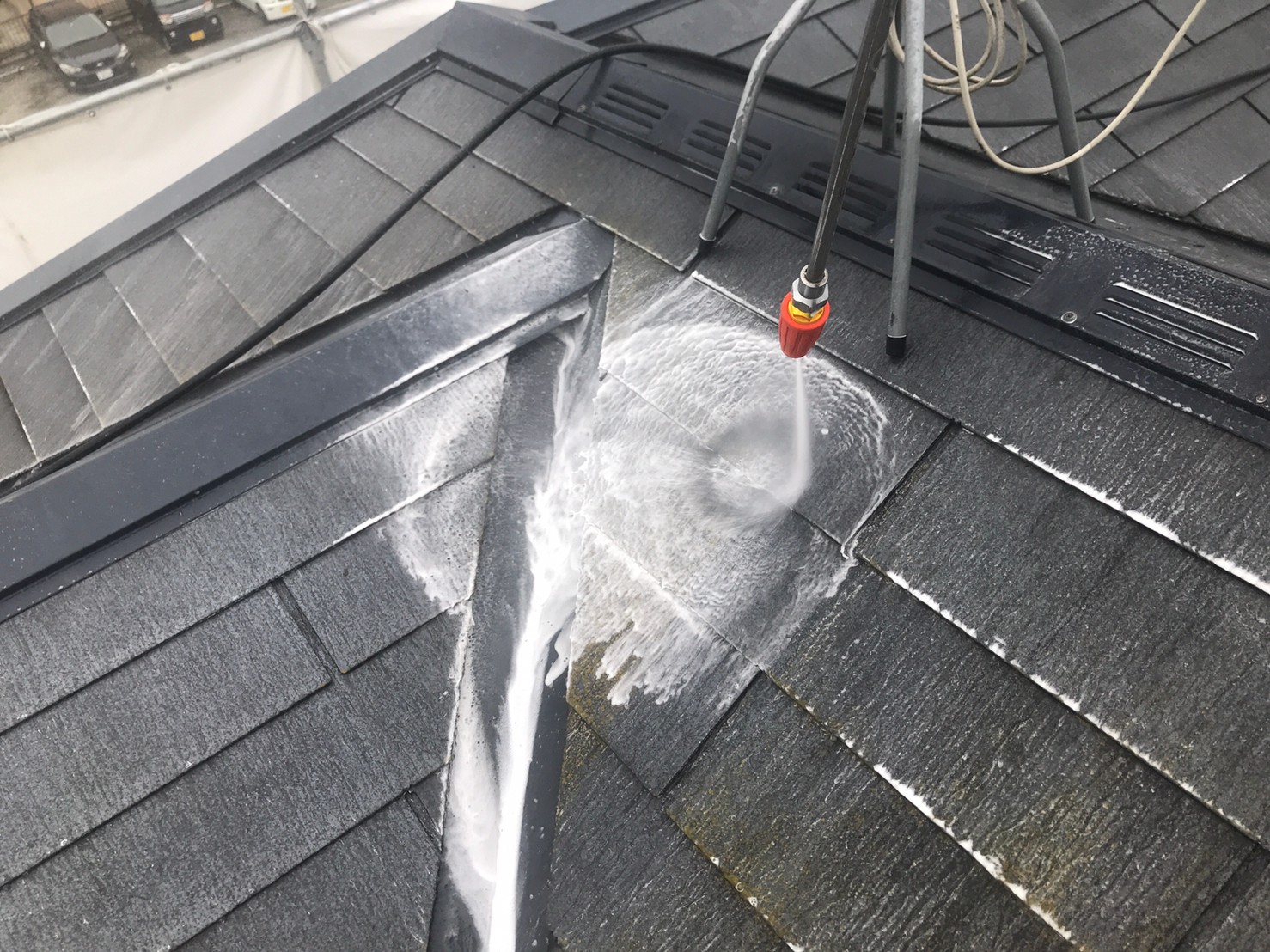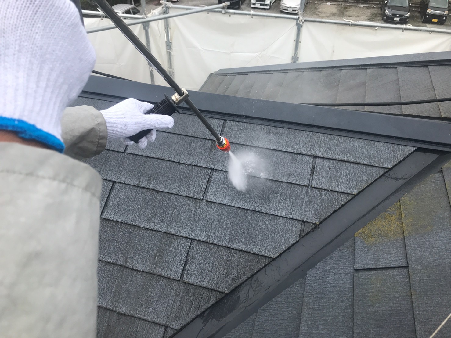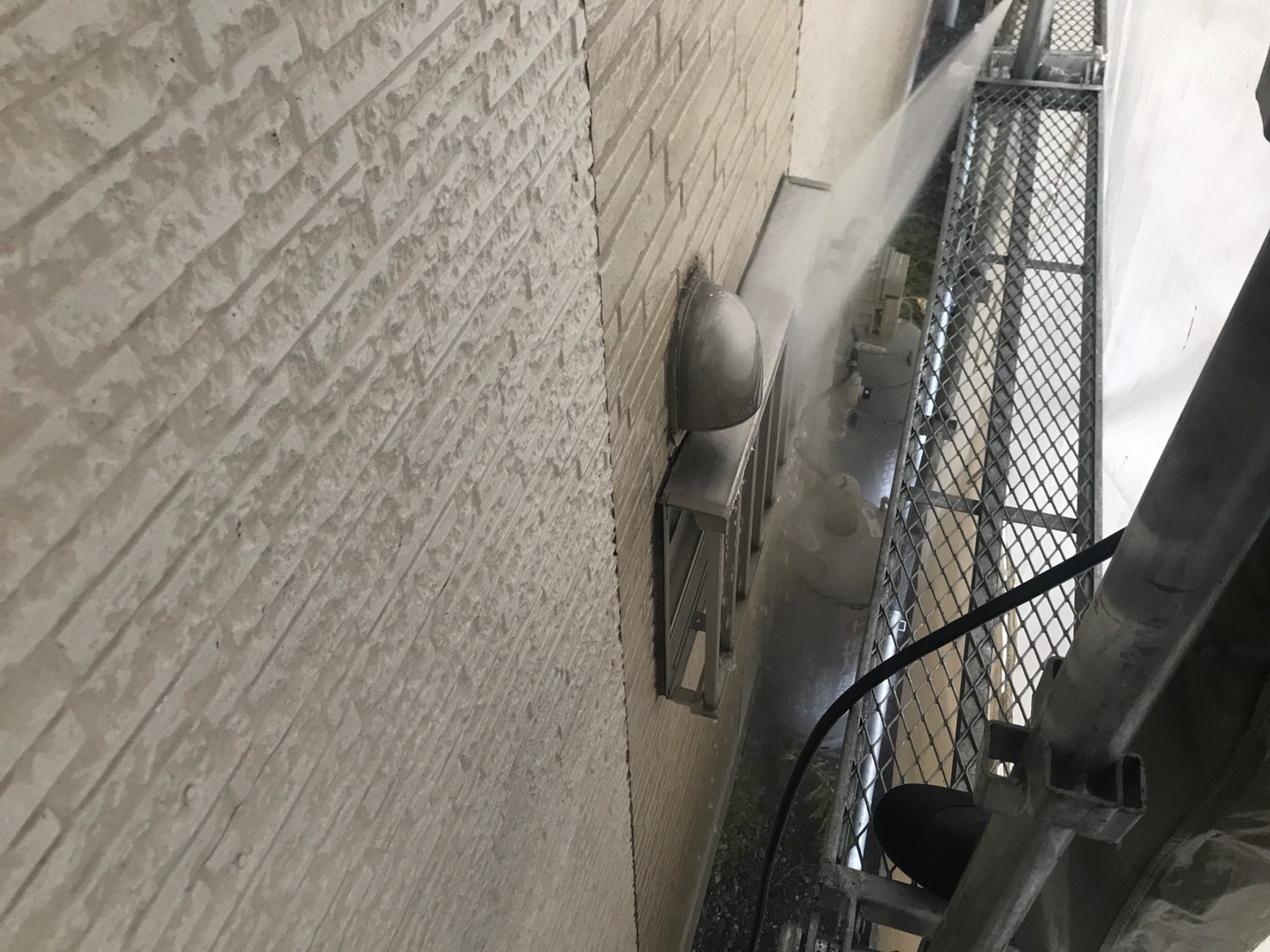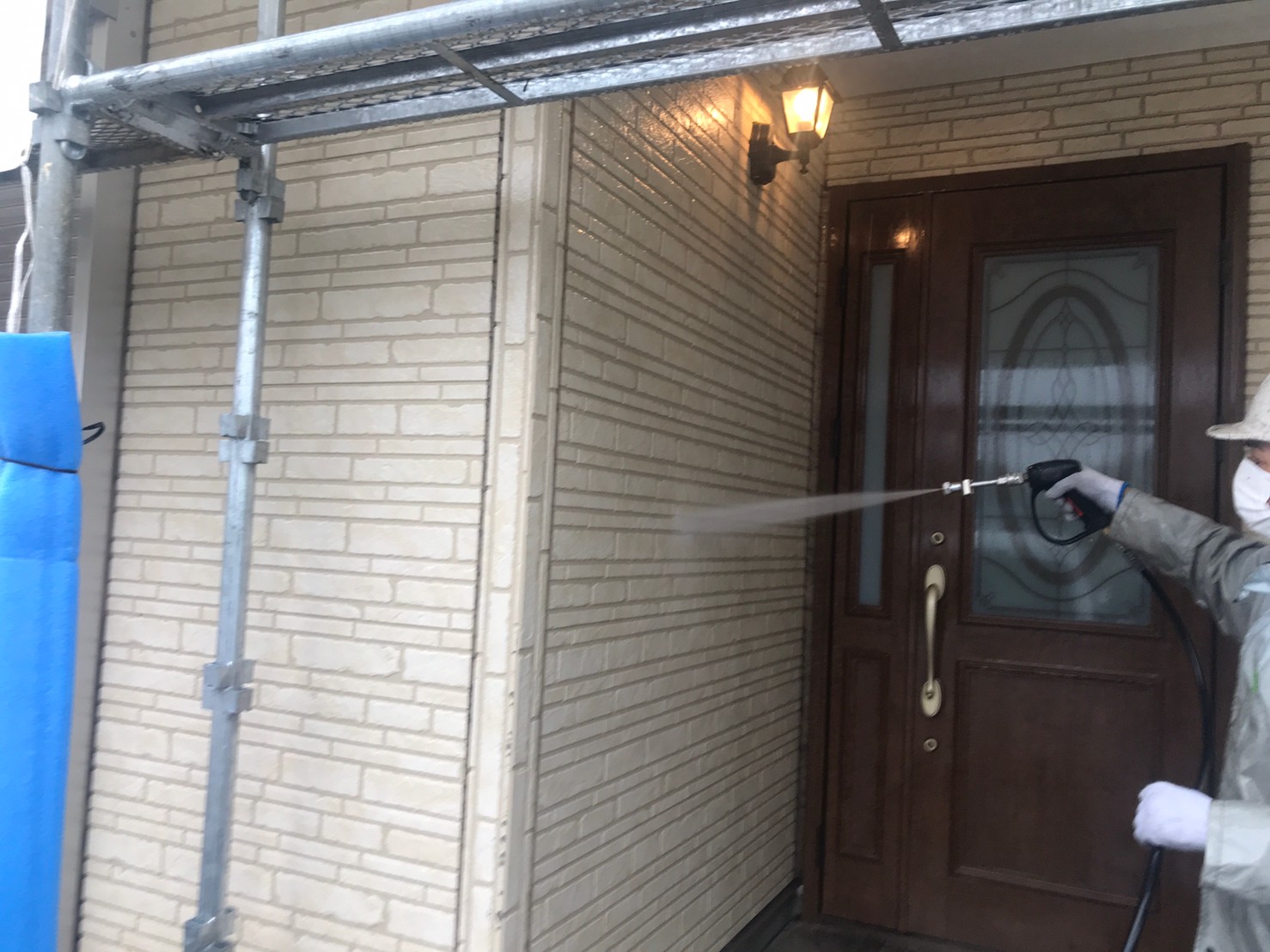 本日は、高圧バイオ洗浄 家の周りは駐車場なので防炎シート使用しました。