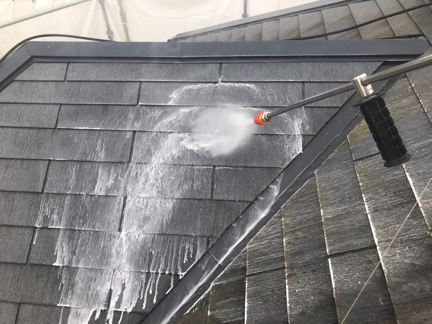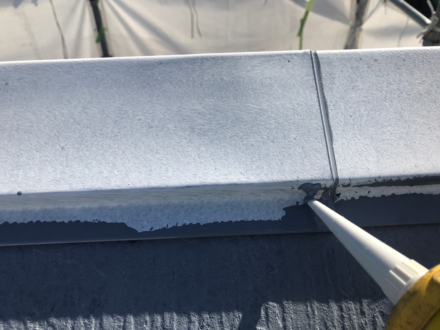 屋根は高圧バイオ洗浄です。 棟板金つなぎ目コーキング、ビス頭コーキング。