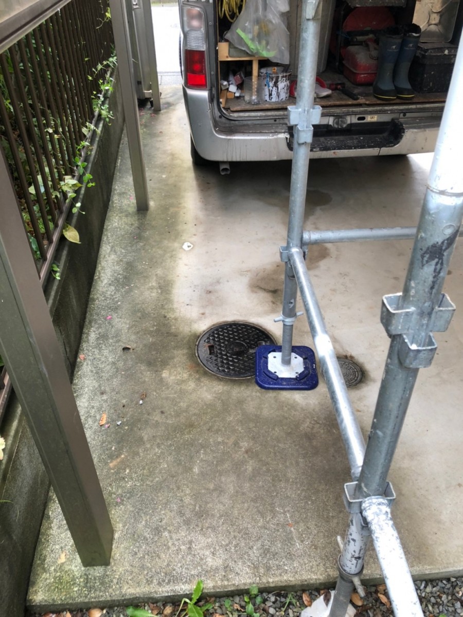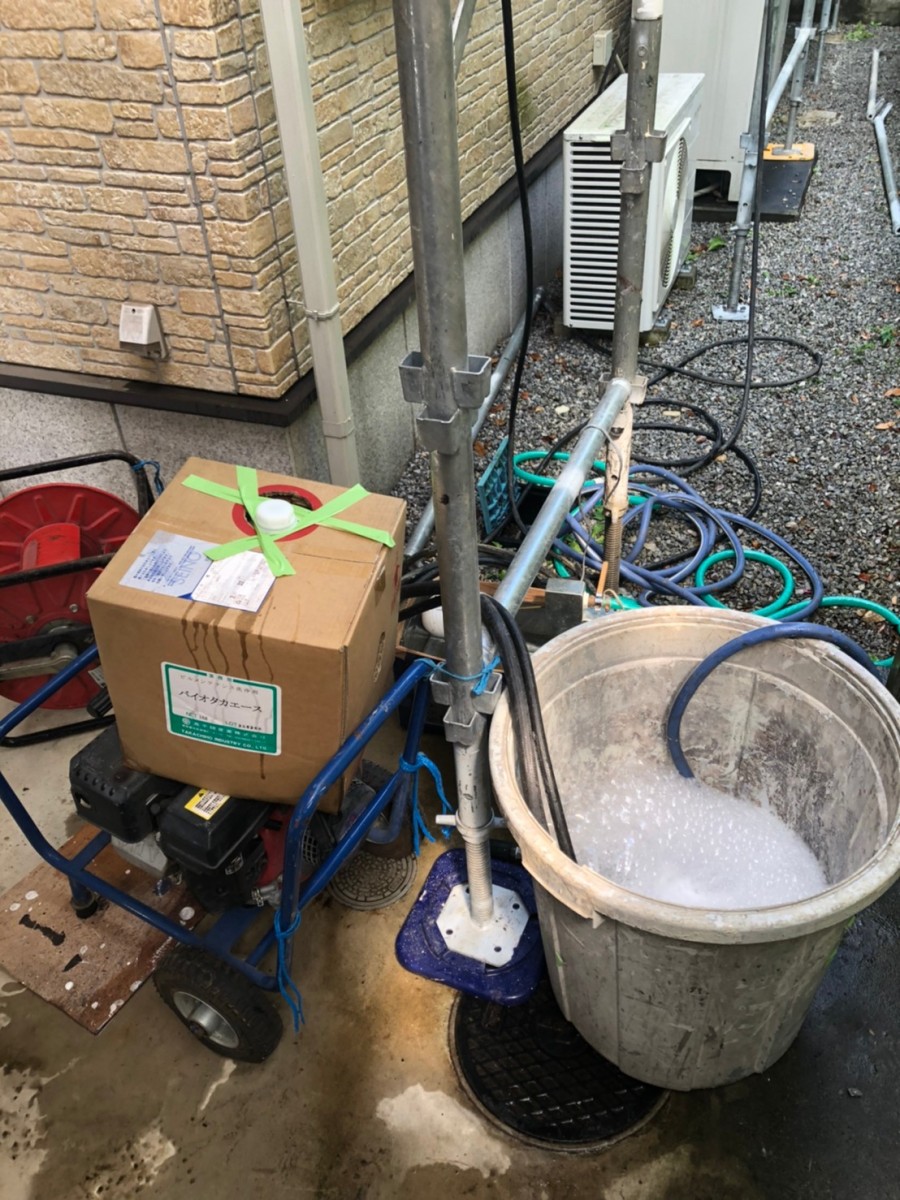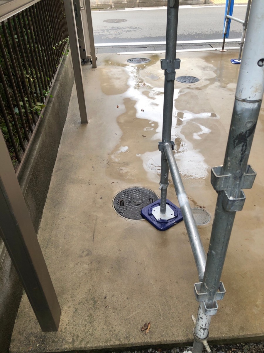 足場架け工事終わりましたので、高圧バイオ洗浄行います。