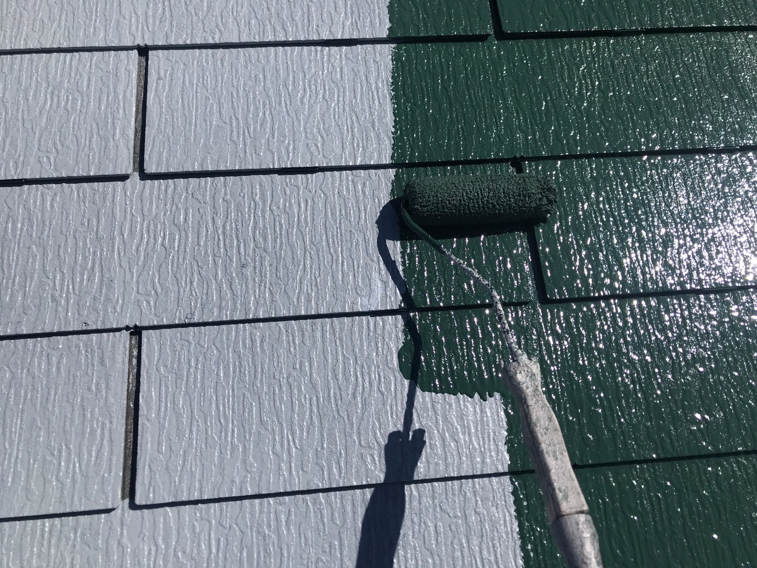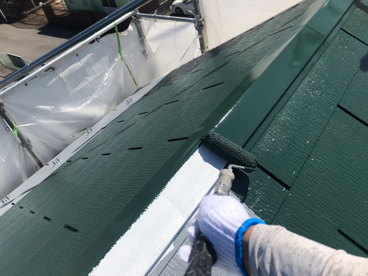 本日は、屋根塗装です。前日下塗り終わりましたので、今日は中塗り上塗りです。 省エネ-3℃