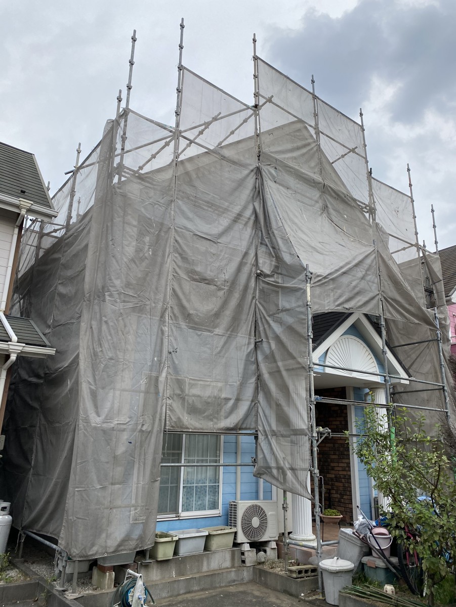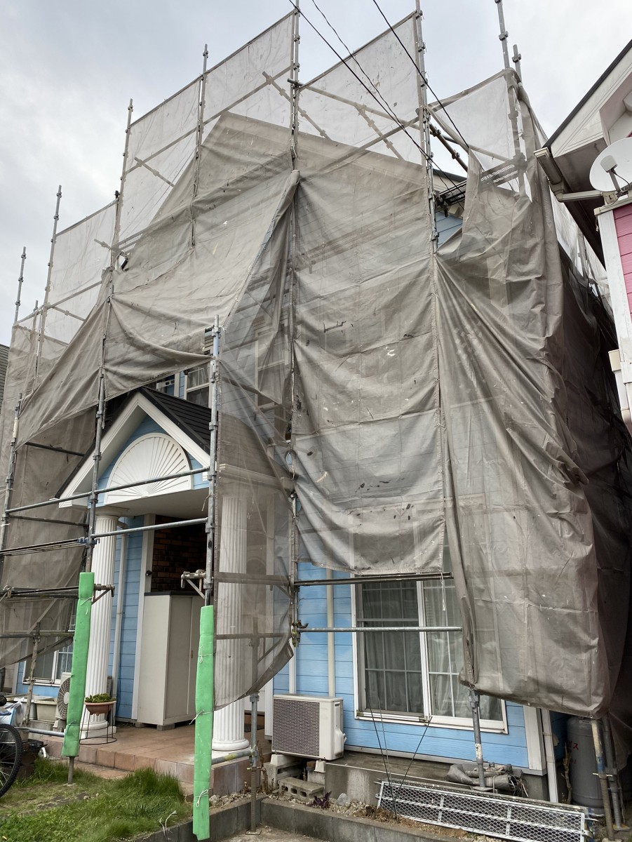 足場架け工事完了です。 明日は高圧バイオ洗浄です。