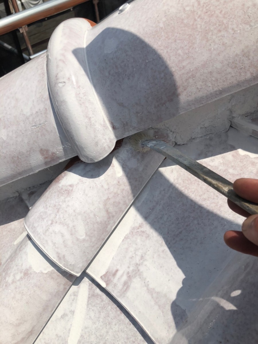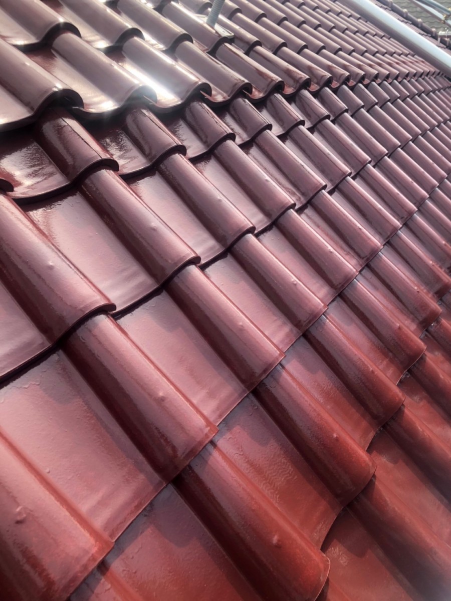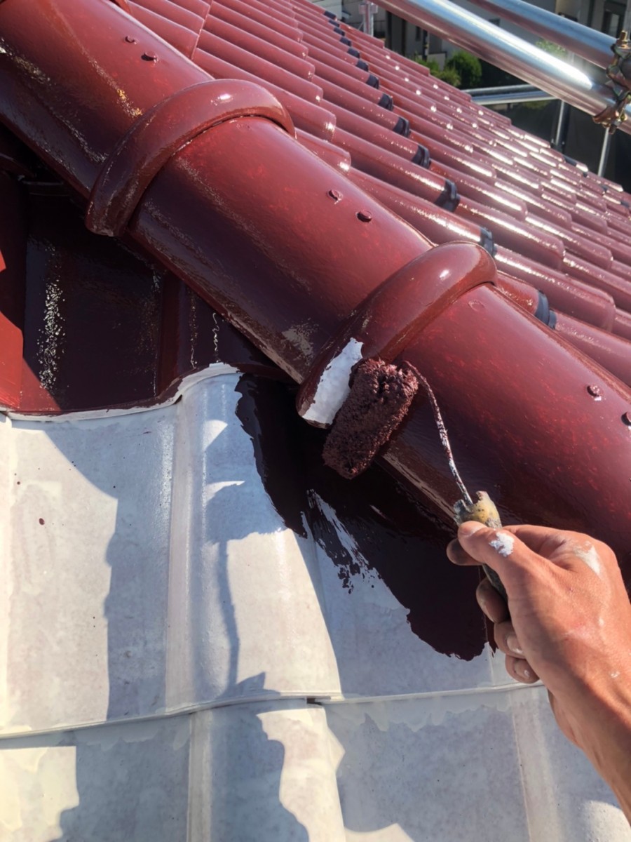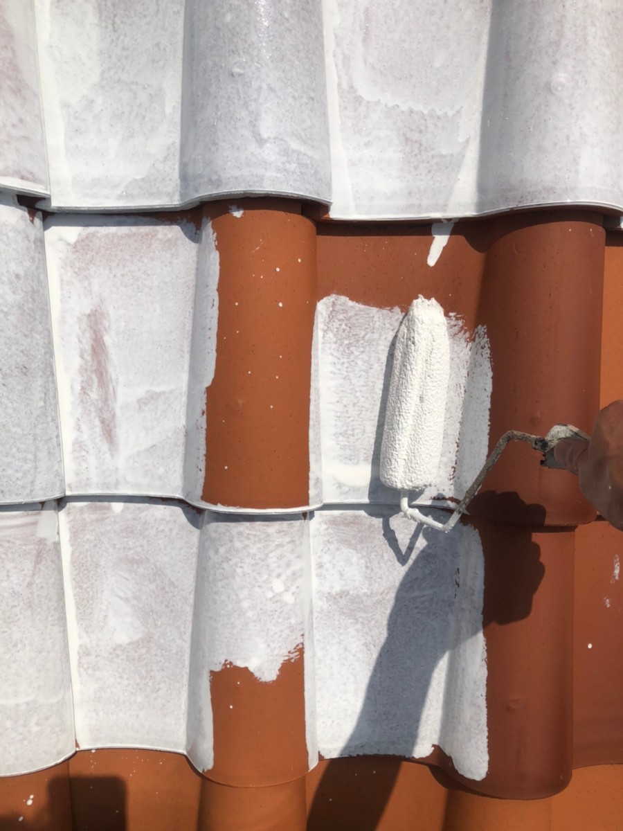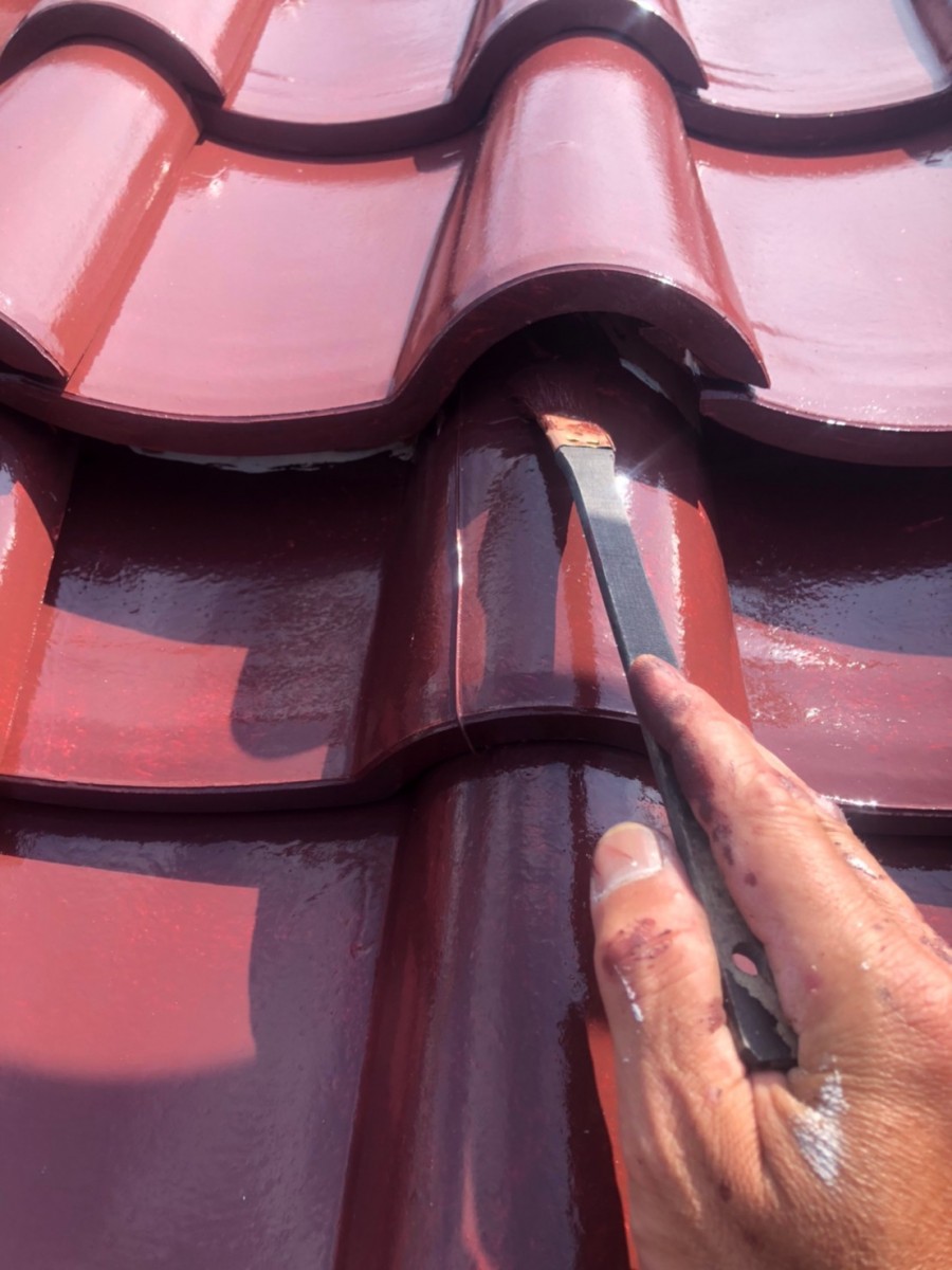 こちらは洋瓦(S型)というもので和瓦やスレートと違い曲線が多く、塗装にはとっても手間暇がかかっています。筆を何種類も使い分けしていますよね。